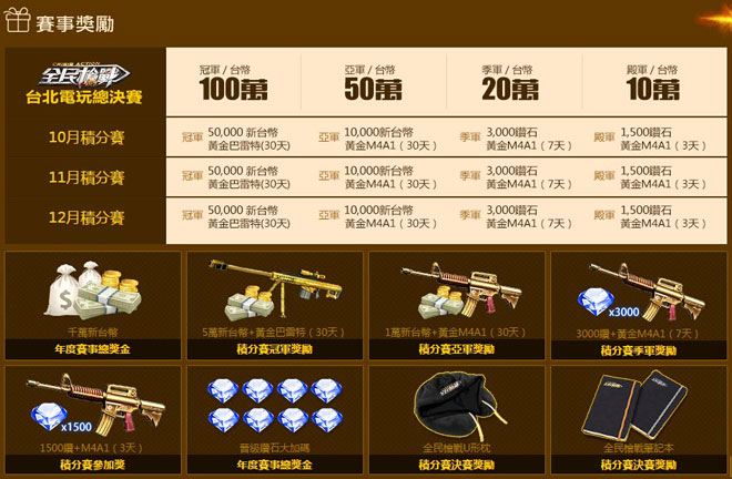 而在各月積分賽中累積分數最高的隊伍,將可榮獲「TGS年度總決賽」的決戰資格,親臨台北國際電玩展高規格的比賽現場,與對戰隊伍面對面直接交鋒、以槍會友論英雄,爭奪總獎金破千萬的現金大獎。